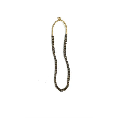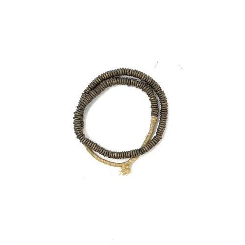 Kenya Brass Heishi beads from Africa. The strand is 13″-15″ long, with beads measuring 1 mm in length and 3 mm in diameter.