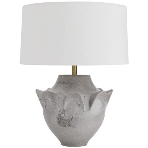 Exaggerated fin details, echoing the works of fashion designer Alexander McQueen, circumnavigate the harbor gray porcelain foundation of the Gael. This striking feature also adds an architectonic element to the overall aesthetic. The large-scale lamp will make a statement in any setting. Topped with a white linen drum shade with white cotton lining and an antique brass sphere finial. Finish will vary.