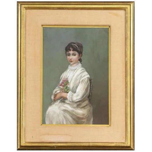 Vintage oil painting of an elegant seated woman in white gown in a gold frame. Vintage painting is oil on board.