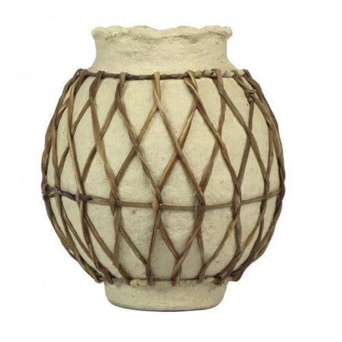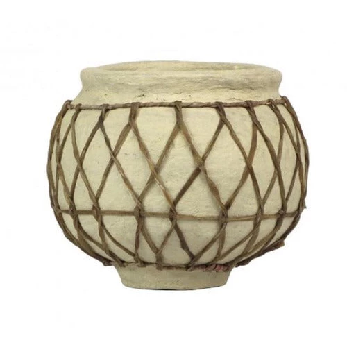 Since at least 202 BC, paper-mâché has been a way of recycling paper into new use. Formed into three classic pottery shapes, these paper mache vessels are wrapped in a leather netting that would have been typical for carrying purposes in an earlier era. Available in three different sizes – Small, Medium and Large. The small Paper Mache Vessel has a gourd vase shape with a scalloped opening that is good for holding faux floral or branches. The Medium vessel is a traditional urn shape with handles. The Large vessel is a pot with a large opening to hide small trinkets.