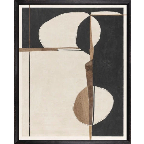 Mid-century vibe of geometric shapes with the beautifully contrasted texture of wood veneer for a truly original take on this modernistic expression. Framed in a minimalist, rounded, antiqued black profile.