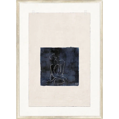 Delicate figurative drawing executed on dark indigo ink rolled surface creates a lovely depth.