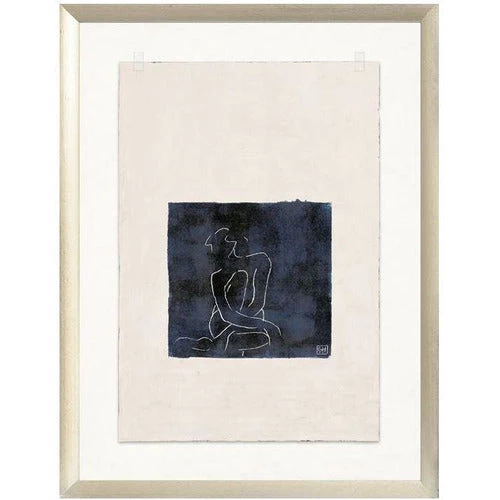 Delicate figurative drawings executed on dark indigo ink rolled surface create a lovely depth in this series. Displayed in a warm silver frame for a lovely neutral palette.