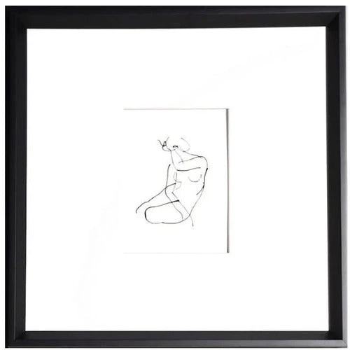 Black and white figurative print of seated female nude. Crisp black frame with matte. 17.25 x 17.25″