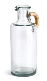 10 1/4″ tall glass pitcher with wicker wrapped handle.