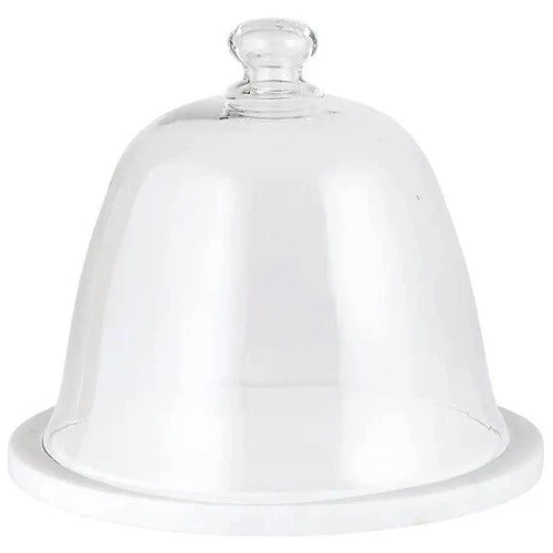 Store any baked goods in this stylish marble + glass dome cake stand. Glass + marble. 10″ x 10″ x 7″.
