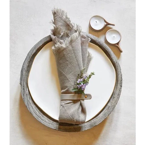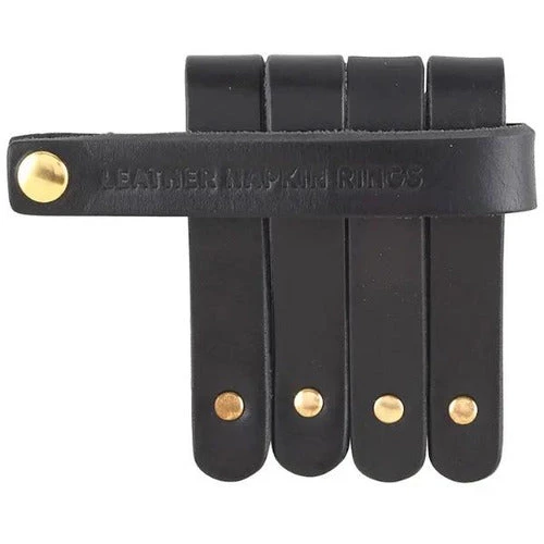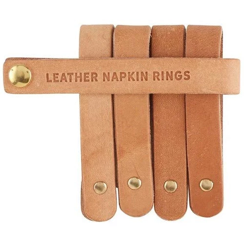 Use these leather accessory rings in many different ways. Small enough to wrap around a tea light or use as a napkin ring. Leather, metal. 3.5″ l, 6″ dia.