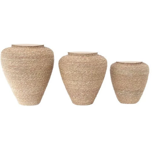 Our Natural Seagrass Rope Jar is a perfect decorative accessory in any home. The jar is designed using Natural Seagrass from the ocean; which is dried then hand twisted to make a rope. The makers carefully hand wrapped the seagrass rope around 3 sizes of metal jars that are sealed for fresh flower usage. Decorate your home with the 3 sizes in a row, or use the jars as a vase for fresh flowers and leaves.