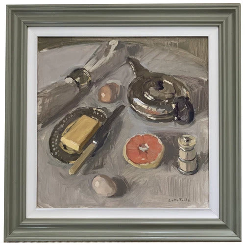 Oil on board still life painting of grapefruit with butter, salt, teapot, and eggs.