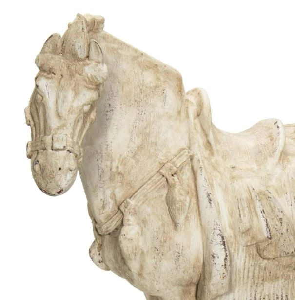 This decorative equine accessory adds a touch of refreshed antique elegance to your space. An old-world white plaster finish and blackened metal components complete the look.